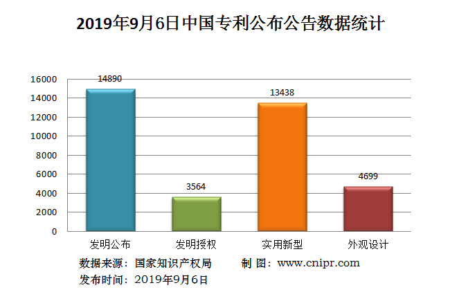 2019年9月6日,中国专利公布数据统计共36591件,其中:发明专利公布14890件;发明专利授权3564件;实用新型专利公告13438件;外观设计专利公告4699件。