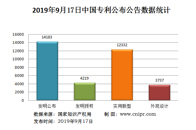 2019年9月17日,中国专利公布数据统计共34471件,其中:发明专利公布14183件;发明专利授权4219件;实用新型专利公告12332件;外观设计专利公告3737件。