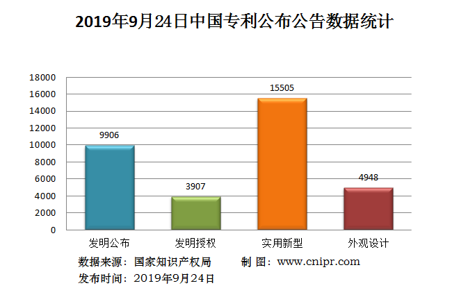 2019年9月24日,中国专利公布数据统计共34266件,其中:发明专利公布9906件;发明专利授权3907件;实用新型专利公告15505件;外观设计专利公告4948件。